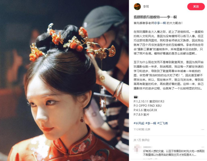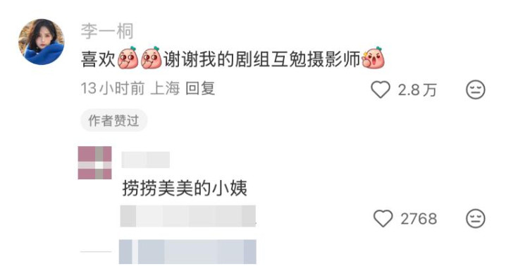 随后,李一桐留言回复:喜欢,谢谢我的剧组互勉摄影师。