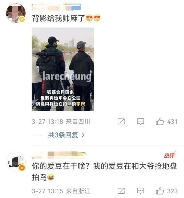 今年3月,有多位网友在北京公园里,偶遇背着专业设备打入大爷摄影团的李现。虽然他包裹严实,还是被网友认了出来。有网友调侃,“李现设备不如大爷的。”随后李现晒出打鸟作业。