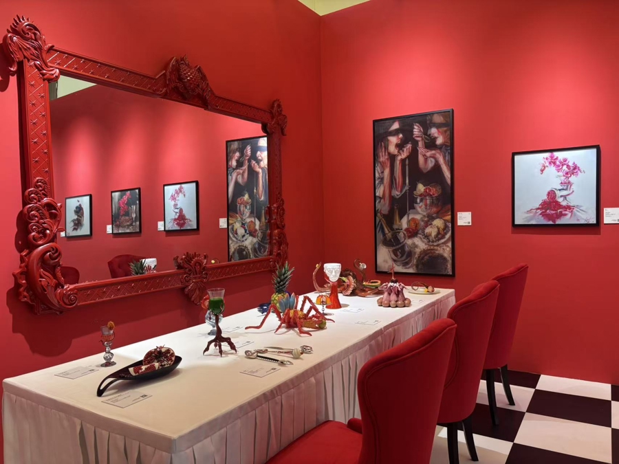 携手艺术家玛丽娜·费德洛娃,艺术平台SputnikPartners竟然呈上一场戏剧感拉满的“红色晚宴”。红色调的复古空间里,挂满了从不同角度观看呈现出不同视效的画作,中间的长条餐桌上则摆放着各式以食物作为灵感的雕塑,被邀请赴宴的观众除了被动旁观,还可以通过手机解锁作品相应的AR影像,成为宴席的一部分。