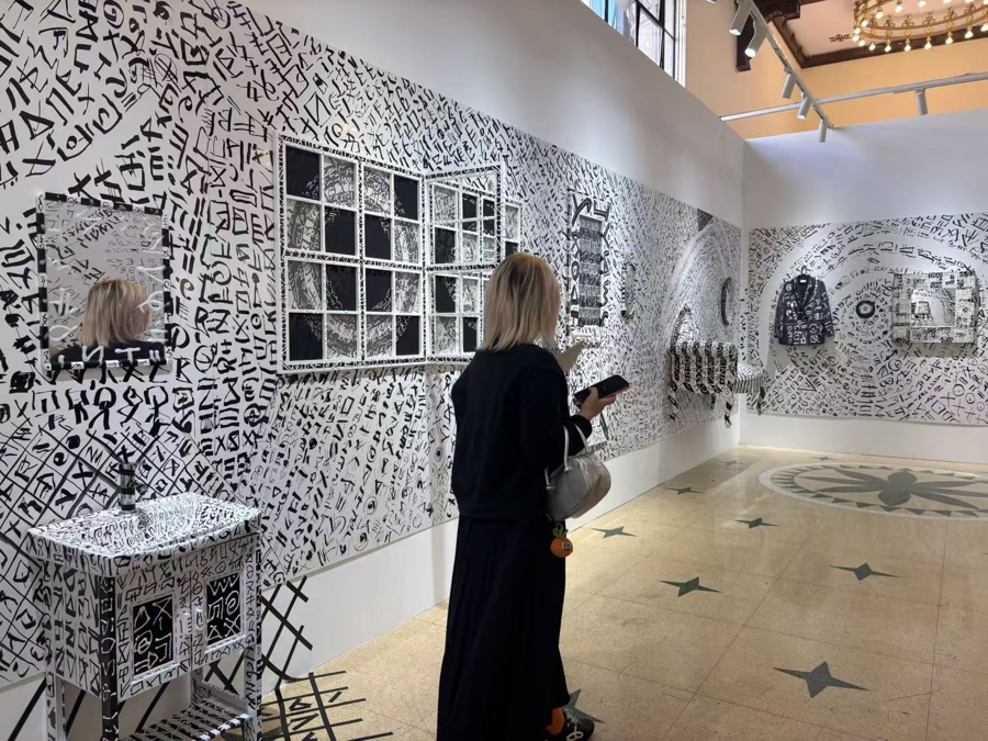记者在展会现场留意到,不少展位变身新奇有趣的整体空间,予人沉浸式艺术体验,吸引观众纷纷拍照打卡、走近艺术。