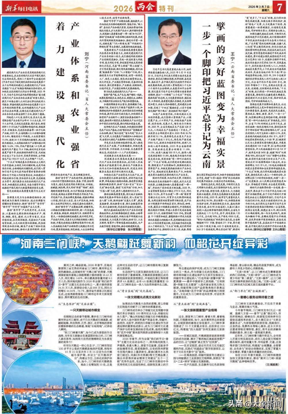 河南是人口大省、经济大省、农业大省,拥有联合国产业分类中全部41个工业大类、197个工业中类,已形成先进装备、现代食品、新型材料3个万亿级产业集群和智能终端、新能源汽车、冷链食品、先进农机装备等一批千亿级产业链。2025年,全省规模以上工业增加值增长8.4%、增速创近十年新高,工业投资增长13.3%、连续24个月实现两位数增长,规上高技术制造业、工业战略性新兴产业增加值分别增长16.6%、13%,手机产量突破1.4亿部,新能源汽车产量达75.4万辆;面对历史罕见的春夏严重干旱、秋收持续阴雨等灾害,及时组织全省上下全力应对,实现旱涝保收,全年粮食总产达1350.97亿斤、比上年增产7亿斤。
